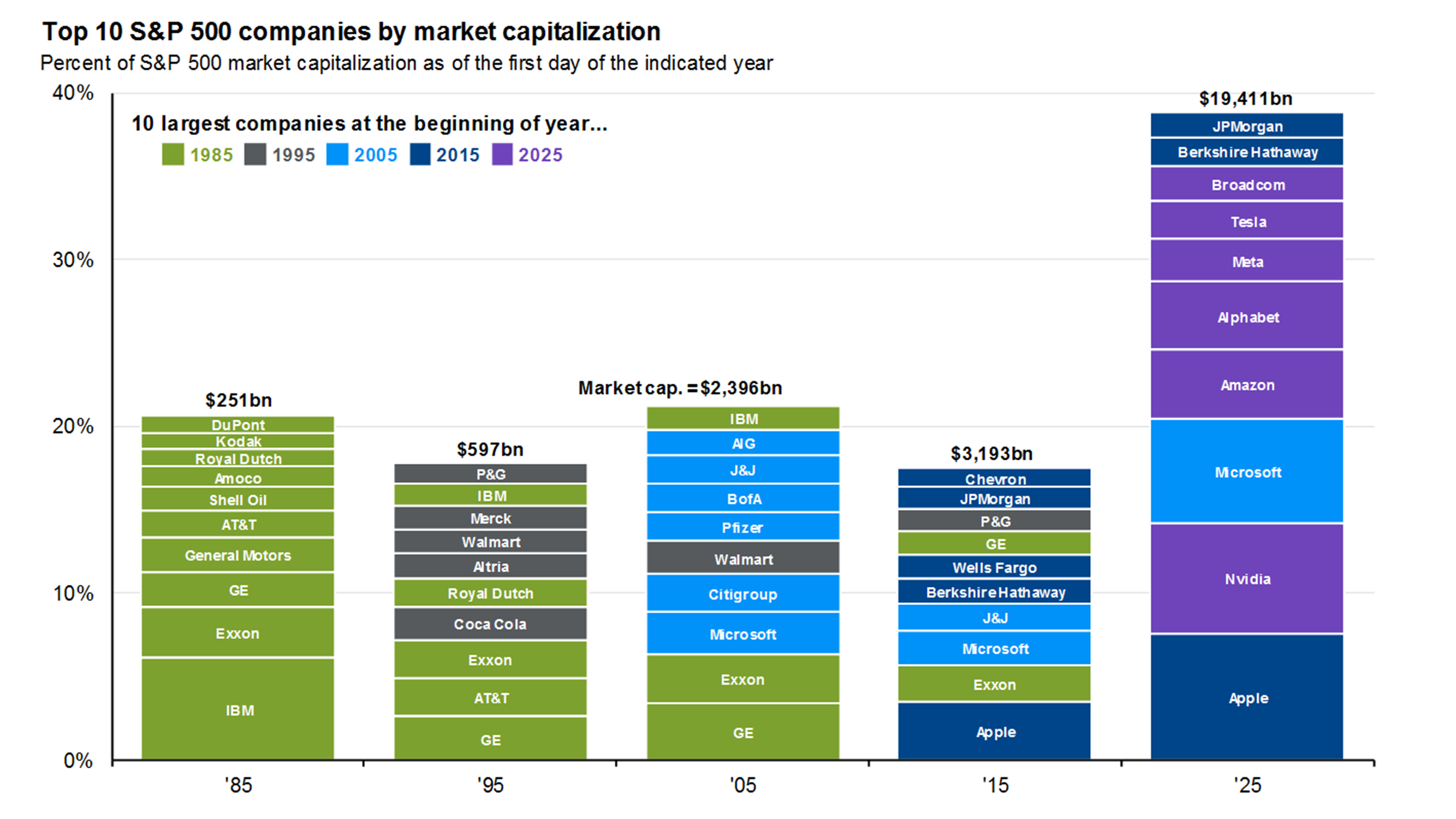 Market leadership does not last forever. While innovation and strong fundamentals matter, periods of extreme concentration tend to evolve as expectations shift, growth broadens, or leadership changes. That process rarely happens on a predictable timeline and is often accompanied by volatility along the way.